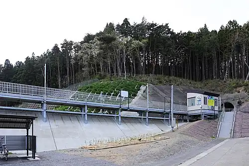 Initially given the provisional name Komeda Station (米田駅), construction work on the new station started on 3 August 2016.[2] The name Tofugaura-Kaigan for the station was selected and formally announced in November 2016.[1] The station opened on 25 March 2017.[1][3] Minami-Rias Line, a portion of Yamada Line, and Kita-Rias Line constitute Rias Line on 23 March 2019. Accordingly, this station became an intermediate station of Rias Line.[4]