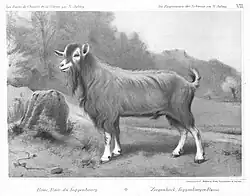 The Toggenburger or Toggenburg is a Swiss breed of dairy goat. Its name derives from that of the Toggenburg region of the Canton of St. Gallen, where it is thought to have originated. It is among the most productive breeds of dairy goat and is distributed world-wide, in about fifty countries in all five inhabited continents.[4]