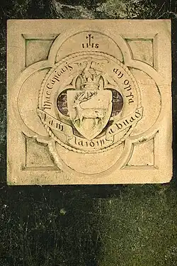 The original ground floor entrance is located to the east, with a window in the western wall since enlarged into an additional doorway. On the right wall of the entrance hall hangs a late 19th century MacCarthy coat of arms funded by Daniel MacCarthy (Glas) (1807–1884),[7] with the lines: Mac Carṫaiġ an orsa, laṁ laidir a buaḋ, which translates to "Mac Carthy of the forces, victory to the strong hand".