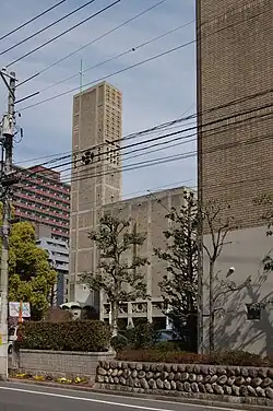 The cathedral is situated between Tange's Peace Memorial Park and JR Hiroshima Station. The volumetric treatment of the design was influenced by Auguste Perret, whereas the inclusion of a circular dome over the sanctuary and small cylindrical chapels on either side of the main volume are echoes of Byzantine architecture.[25] The post-and-beam concrete frame with internal panels is reminiscent of traditional Japanese architecture as are the shapes of the windows penetrating the tower. The brick infills in this case were made from earth containing ashes from the atomic bomb and are laid so that their rough surfaces cast shadows across the façade. Architect Kenji Imai designed the sculptures above the main door. Murano undertook a number of religious projects after this one and converted to Catholicism later in life.[26]