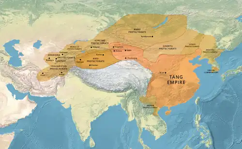 The Western Turkic Khaganate itself was destroyed by the Tang dynasty in 657 CE, and most of his territories became protectorates of the Tang Empire, and organized into regional commanderies.[19] Kunduz became the site of the Yuezhi Commandery (月氏都督府, Yuèzhī Dūdùfû) under administration of the Anxi Protectorate.[21]