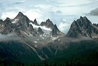 Tokosha Mountains is a 6,148 ft (1,870 m) multi-peak massif located in the Alaska Range, in Denali National Park and Preserve, in Alaska, United States. It is situated between the toes of Ruth Glacier and Tokositna Glacier, 27 mi (43 km) south-southeast of Denali and 26 mi (42 km) northwest of Talkeetna.[3] Despite its relatively low elevation, it is notable for its Teton-esque granite spires which can be seen from the George Parks Highway. Precipitation runoff from the mountain drains into the Tokositna River → Chulitna River → Susitna River. Topographic relief is significant as the highest summit, Grand Tokosha, rises 3,850 feet (1,173 meters) above the Ruth Glacier in one mile (1.6 km).