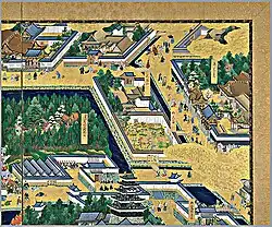 The Suruga Dainagon Residence was close to Honmaru enceinte of Edo Castle to the northwest, and is depicted on the upper right side of the "View of Edo" folding screens from the 17th century.