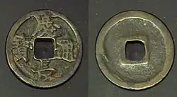 In 1835 the Tokugawa government started minting copper 100 mon named Tenpō Tsūhō (Kyūjitai: 天保通寶 ; Shinjitai: 天保通宝) as a way to solve its budgetary deficit, as the coin contained only 5½ as much copper as a 1 mon Kan'ei tsūhō this eventually lead to inflation.[9][10] This was later followed by the Satsuma Domain issuing a 100 mon coin of their own in 1862 to supposedly produce currency for the Ryukyu Kingdom, while in reality doing it to boost their own economy. These Ryūkyū Tsūhō (琉球通寳) coins eventually started circulating in other provinces as well.[11][12][13]