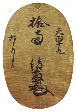 The Ōban (大判) was a very large gold coin plate, equivalent to ten Ryō, or ten Koban (小判) plates. It was used for ceremonies and as rewards.[6]