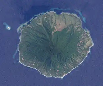 Tolokiwa Island is situated 75 km north of the New Guinea mainland. The island has a diameter of 7 km and an area of 46 km2. Its highest point in the Sulany peak at 1372 metres. The island was built up by a series of volcanic eruptions during the Pleistocene epoch.[4] The well-vegetated[5] island is an important natural site for birds,[6] and is home to several species of resident birds (which it unusually shares with nearby islands). However, these may not be birds indigenous to the island as it is believed that wildlife would have been wiped out by a volcanic eruption on Long Island in the mid 17th-century.[3][7] Tolokiwa is also home to a subspecies of Turdus Poliocephalus, the Tasman Sea island thrush.[8]