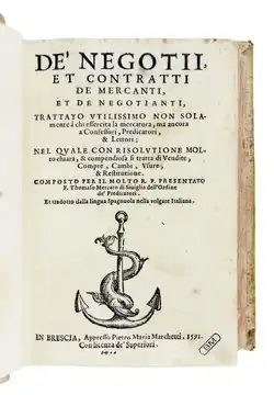 He devotes much thought to the concept of the fair or "just price", analysing it in terms of wheat, and strongly supporting the fixed price set by the government (tasa del trigo) on social and ethical grounds, even if it meant producers selling at a loss.[6] He considered thus that the prices control politic of the Spanish authorities were a divine obligation made to the prince, in charge of tranquillity and peace of the kingdom.[7] Consequently, Mercado is a vigorous supporter of the intervention of the State in the economy, in the contrary of Luis de Molina or Leonardus Lessius, who considered that any intervention of the authorities is inopportune owing to the corruption and the clientelism that it will create.[8]