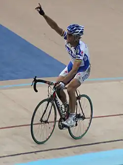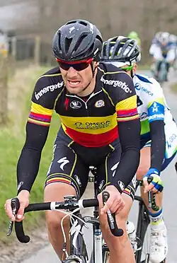 Tom Boonen (Dutch pronunciation: [ˈtɔm ˈboːnə(n)]; born 15 October 1980) is a Belgian former road bicycle racer,[1] who competed as a professional between 2002 and 2017 for the U.S. Postal Service and Quick-Step Floors teams and a professional racing driver who currently competes in Belcar, having previously competed in the NASCAR Whelen Euro Series. Boonen won the 2005 UCI World Road Race Championships, and was a single-day road specialist with a strong finishing sprint. He won the cycling monuments Paris–Roubaix four times and the Tour of Flanders three times, among many other prestigious victories, such as prevailing five times in the E3 Harelbeke, winning six stages of the Tour de France and winning the Overall title of the Tour of Qatar four times.[2]