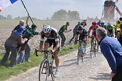 At the very beginning of the season, Boonen won stage 2 of the Vuelta a San Juan.[38] This was the first professional victory for a cyclist using disc brakes.[39] However, he subsequently suffered a series of crashes at the Tour of Oman, Omloop Het Nieuwsblad and Tirreno–Adriatico.[40] At Milan–San Remo, Boonen worked as a domestique for his teammates, helping Julian Alaphilippe to third place.[41] He resumed his cobbled classics campaign at E3 Harelbeke, where he animated the race with an attack on the Taaienberg on his way to an eighth-place finish.[42] He followed this up with a sixth place at Gent–Wevelgem, which he described as a satisfactory result, and a good indicator of form going into the cobbled Monuments.[43]