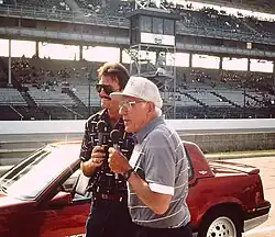 At that time Carnegie, who knew nothing about auto racing, had no advance preparation for the event. All he had was a list of drivers and the numbers of their racecars. As with all the other spectators, Carnegie could not see the entire 2.5 miles (4.0 km) of the oval track.[12] He later remarked: "I had never seen such a crowd, let alone a 500-Mile Race" and "it took me ten to fifteen years to have any confidence that what I was saying was right."[9] Carnegie remained the Speedway's announcer for six decades.[10] His signature phrases were "Annnd heeee's on it!" as a driver would come down the Speedway's front stretch to take the green flag, which signaled the start of the driver's qualifying four-lap run, and reported especially fast laps in qualifying efforts with "Listen to this one, fans, you won't believe this!" followed by his favorite line, "It's a neeeeeww track record!"[12] Tony Stewart once remarked: "You take him and put him on a microphone at a race track and if you know anything about racing, you know who that is on the other end of the microphone."[10] Later in life Carnegie acknowledged, "I'm on the P.A. to inform,"[13] but he also wanted to create excitement for the fans, and considered his broadcasts as "speed theater."[9]