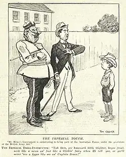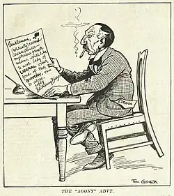 The political demise of Billy Hughes and the ascendancy of Stanley Bruce was represented as a tragedy for Australian cartoonists, as depicted in Glover's cartoon in The Bulletin of 8 February 1923.[20] Hughes' physical characteristics had been considered to be "God's gift to cartoonists". When Bruce became Prime Minister, according to a satirical article in Sydney's Daily Pictorial, "all over Australia the cartoonists sat dumbly biting their pencils, trying to figure out what they could do with the regular polished countenance of Stanley Melbourne Bruce". It was Glover that "leapt, pencil in hand, into the breach". The Bulletin artist solved the problem by representing him as "a blase, supercilious, spatted figure [who] strutted with a grand air of dignified aloofness across the boards that [Hughes] had vacated".[21] In December 1926 it was reported that the Australian Prime Minister, Stanley Bruce, had a "very fine private collection" of Australian art, including a set the original artwork of cartoons of himself by Tom Glover.[22]
