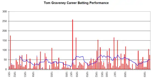 Recalled by England in 1966 against the West Indies, he scored heavily, including 165 at the Oval, aged 39, described as "arguably the best innings of his life" by one report.[2] He later said that his England recall "came totally out of the blue" and that a West Indian supporter in the crowd shouted "Heh, Graveney, haven't they got a pension scheme in this country?"[5] He remained in the team in the following seasons, performing well at home and on tour, and captaining England against Australia for one match in 1968 when Colin Cowdrey was unavailable.[2] He was vice-captain for three years.[3] He was awarded the OBE in 1968, described by one writer as a "rare distinction" for someone still playing.[4]