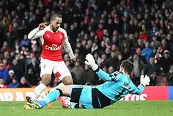 On 20 July 2016, Heaton signed another new contract, this time a four-year deal running until the summer of 2020.[63] On 29 October, Heaton made numerous saves during the match against former club Manchester United, the highlight being a mid-air, fully extended save of Zlatan Ibrahimović that Heaton claimed "nearly broke [his] arm".[64] Afterwards, Heaton required medical attention but remained in the match to lead Burnley to a 0–0 draw, being named Man of the Match in the process.[65] In the same season on 22 January 2017, Heaton made his 150th league appearance for the club as he was beaten by a 97th-minute penalty from Alexis Sánchez that saw Arsenal win 2–1.[66][67]