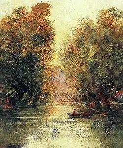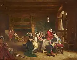 He retaliated by disseminating quantities of fakes of sufficient quality to fool the experts, hoping to destabilize the system. At one point in the 1950s, so many "newly-discovered" Krieghoffs had come on the market that prices were acutely depressed, over fears many were fake, neatly achieving two of Keating's goals: to reduce the profits of greedy art dealers, and to make beautiful pictures from one of his favourite artists more affordable to the buying public.[26] Some twenty years later, a Sotheby's expert on Canadian art lamented, due to unceasing difficulties in making a firm identification of Krieghoff's work, that instead of listing them under the artist's full name – to indicate full confidence in their authenticity – they catalogued paintings in a 1976 auction as merely, "attributed to Krieghoff". Prices however, had made a handsome recovery; they sold for $11,000–$13,000.[27]