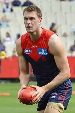 After a strong pre-season in 2012,[10] he played his first match for the year in the 108-point loss to West Coast at Patersons Stadium in round two.[11] He spent the season playing full back.[12] After playing on Jonathon Patton in the seventy-eight point win against Greater Western Sydney at the Melbourne Cricket Ground in round thirteen he was named the round nominee for the Rising Star where he recorded twenty-six disposals, four marks and three tackles.[13] He missed his first match of the year in round fifteen after he suffered from a bleeding lung as a result of a collision during the sixty-one point loss against Brisbane the previous week.[14] He returned for the round sixteen match against Fremantle at Etihad Stadium and played the remainder of the year to finish with twenty matches for the season.[15] His performances during the year earned him third-place in Melbourne's best and fairest count, behind Nathan Jones and Jack Grimes,[16] and the Harold Ball Memorial Trophy as Melbourne's best young player.[17] Furthermore, he finished sixth in the Rising Star award.[18]