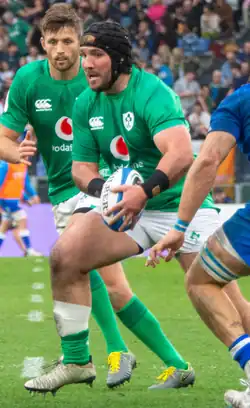 In 2020–21 he made fifteen appearances, including two starts,[1] and made 141 tackes and one turnover.[15] In June 2021 he was called up again to the senior Ireland squad for the Summer tests,[16] and made his senior international debut in a 71–10 victory over the United States on 10 July 2021.[17] In the 2021–22 season he has made 15 appearances, including eight starts,[1] and appeared off the bench for Ireland in their 53–7 home win over Argentina in the 2021 Autumn internationals.[18] He was called up to the Ireland squad for their 2022 tour of New Zealand.[19] He was called up to Ireland's 2023 Six Nations Championship squad coming off the bench in all 5 matches as Ireland won the championship and Grand Slam.[20] He was called up to the Ireland squad for their two-match tour of South Africa in July 2024.[21]
