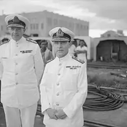 Admiral Sir Tom Phillips (right), commander of Force Z, and his deputy, Rear Admiral Arthur Palliser,[4] on the quayside at Singapore Naval Base, 2 December 1941.