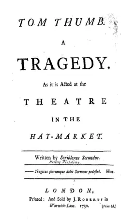 When the play was no longer featured alongside of The Author's Farce, the satire becomes less evident. To combat this problem, Fielding added other components, including footnotes, prefaces, and prologues, to the second edition of the written version.[2] This is another component that Tom Thumb shares with The Tragedy of Tragedies, and an aspect common to Fielding's so-called 'Scriblerus plays', which incorporate the use of H. Scriblerus Secundus as a pen name for the print editions.[3]