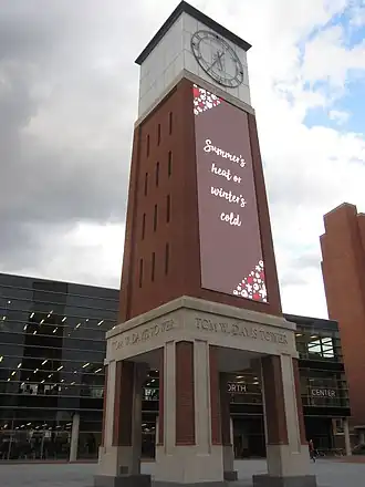 The Tom W. Davis Tower is a clock tower at Ohio State University in Columbus, Ohio. It is located near the North Recreation Center and features a 20-by-40-foot (6.1 m × 12.2 m) light-emitting diode display and a large clock. It was completed in autumn of 2017.[1][2][3][4][5] The tower displays inscribed quotes from William McKinley, John F. Kennedy, and Roberto Clemente at its base.[6]