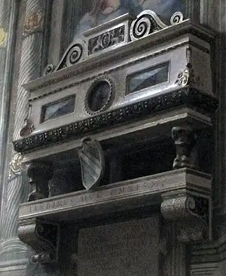 Guerrini, in 1926, identified the document's M. Gaspare of Milan,[3] the creator of the tomb, as Gaspare Pedoni. This was caused by a historic confusion by Giorgio Vasari of identity between two eponymous sculptors in the sixteenth century.[6] In 1954, however, Tonolini and Monegatti identified the sculptor as Gasparo Cairano,[7] an attribution that has been accepted by subsequent historiography and reiterated by Vito Zani in 2010.[5]