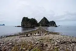 Tombolo begins at Hamase Beach on Dogashima and extends to Elephant Island and Nakano Island of the Sanshiro Islands.[2] A small canal cuts off Tombolo between Elephant and Nakano Island.[2] The tombolo is 250 meters long and 30 meters across at low tide between March and September.[3] Rather than being sandy, the tombolo is stoney, with the rocks often covered by seaweed and slippery to walk on.[3]