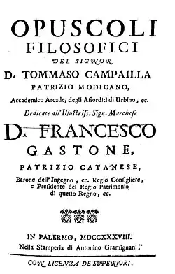 Tommaso Campailla was born in Modica, near Syracuse, in 1668. His family belonged to the local nobility.[1] At sixteen he was sent to Catania to study law. He employed his leisure hours in the study of literature, philosophy, science, astronomy, and physics.[1] He studied both neo-Scholastic and Cartesian philosophy, and adopted a mechanical view of the universe.