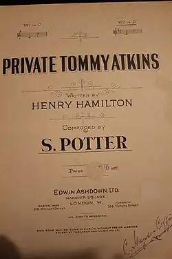 In 1893, for the musical play A Gaiety Girl, Henry Hamilton (lyrics) and Samuel Potter (music) wrote the song Private Tommy Atkins for the baritone C. Hayden Coffin. It was immediately published by Willcocks & Co. Ltd. in London[10] and published by T. B. Harms & Co. in New York the next year.[11] The song was also reintroduced into later performances of San Toy for Hayden Coffin. He recalled singing it on Ladysmith Night (1 March 1900) where "the audience were roused to such a pitch of enthusiasm, that they rose to their feet, and commenced to shower money on to the stage".[12]