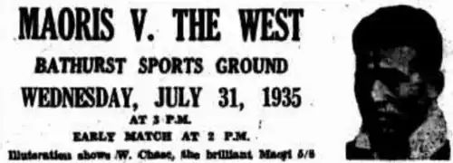 He played at second five eighth in their next game against Western NSW at Bathurst on July 31. In an advertisement for the game a photograph of Chase was used to promote the game. New Zealand Māori won 42-8 before 3,000 spectators with Chase scoring a try and kicking a drop goal.[239] At five eighth he “opened up the play well, gave sharp passes, and kept in the movement after giving the transfer. He had a good colleague in Kotua”.[240] With the score 11-8 early in the second half Chase “kicked a neat goal from the field” and this opened the floodgates with the Māori side scoring 27 points “in less than that many minutes”.[241]