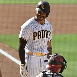 In 2021, Pham batted .229 (the 7th-lowest batting average in the NL)/.340/.383(3rd-lowest) with 15 home runs, 49 RBIs, and 14 stolen bases in 561 plate appearances over 155 games.[62] He led the major leagues with 30 pinch hitting appearances.[63] On November 3, the Padres granted him free agency.[18]