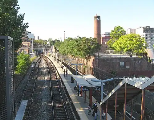 The north entrance leads to Victory Boulevard, where an overpass leads west to Bay Street and east to Joseph H. Lyons Pool. There is a parking lot adjacent to the southbound track at Victory Boulevard.[2] The south entrance leads to Hannah Street. There is a third track adjacent to the southbound track at the southern end of the station; it is part of the Tompkinsville Non-Revenue Repair Shop, which contains barns on both sides of the line and is south of this station.[3][2] The shop was repaired in the 1990s, with the contract awarded in May 1994 for $1,969,777. As part of the project, a 4,000-square-foot (370 m2) addition was made to the facility, the existing freight house was demolished, the interior of the shop building was renovated, and the area in front of the building was paved.[4]: C-88 The Victory Boulevard pedestrian overpass was replaced in 1999.[5]