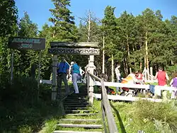 One of the most interesting heathen sanctuaries is the sanctuary of Perun near Veliky Novgorod in Peryn district on Il'men lake. The heathen temple erected at "Tomskaya Pisanitsa" is the halved reconstruction of this sanctuary. A platform is paved with flagstone to make the inspection more convenient. For the same purpose the ditch is substituted with stones lined on the edge of lobes. On the exposition in the center of the heathen temple there is a copy of the Zbruch idol. The Zbruch idol is the 10th-century sculpture. This is one of the rare monuments of Slav heathen cult, which was found near Gusyatin village in river Zbruch (inflow of Dniester) in 1848. After the adoption of Christianity it was probably thrown into the water (like the idols of Perun in Kiev and Novgorod). Zbruch idol is a tetrahedral column with three tiers of patterns: in the lower underground deity is depicted, on the average there are the earth and people, in the upper — the sky and gods (attributes of the main god are a horse and a sword).