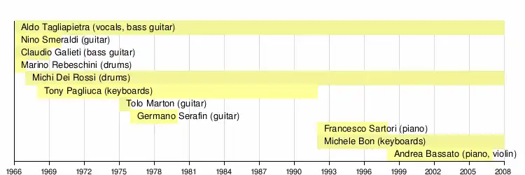 In 1967, the day after recording their first single, "Fiori e Colori", for Milan's CAR Juke Box label (having been rejected by EMI), Rebeschini left for the military. He was quickly replaced by Michi Dei Rossi of the dissolved Hopopi. The following year, their second single, "Senti l'estate che torna", was chosen to participate in Un disco per l'estate, a televised music competition organised by the Italian Phonographic Association and RAI.[3] It was at this time that Tony Pagliuca (formerly of Hopopi and I Delfini) joined the group on keyboards. Later in the same year, the band began recording its first album, Ad gloriam, to be released in 1969. The title track was sampled by Irish DJ David Holmes for his 2000 album Bow Down to the Exit Sign, under the name "69 Police". It was then re-used in the Ocean's Eleven soundtrack, where it features prominently in the final scene. Soon Galieti left for the military as well, leaving Tagliapietra to cover on bass guitar. Not long after, Smeraldi left as well, leaving the trio that would be at the core of the band for its most successful era. An evolution in their sound towards more richness and complexity can already be heard in a non-album single the band would publish in 1970, "Il Profumo delle Viole / I Ricordi Più Belli".