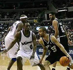 William Anthony Parker Jr. (born 17 May 1982)[1] is a French-American former professional basketball player and majority owner of LDLC ASVEL of the LNB Élite and the EuroLeague. The son of a basketball pro, Parker started his career at Paris Basket Racing in the French basketball league before joining the San Antonio Spurs of the National Basketball Association (NBA). He was selected by the Spurs with the 28th overall pick in the 2001 NBA draft, and quickly became their starting point guard. Parker won four NBA championships (2003, 2005, 2007, and 2014), all of which were with the Spurs. He also played for LDLC ASVEL in France during the 2011 NBA lockout, and finished his playing career after one season with the Charlotte Hornets. He retired as the ninth leading scorer and ranks fifth in career assists in NBA playoffs history.