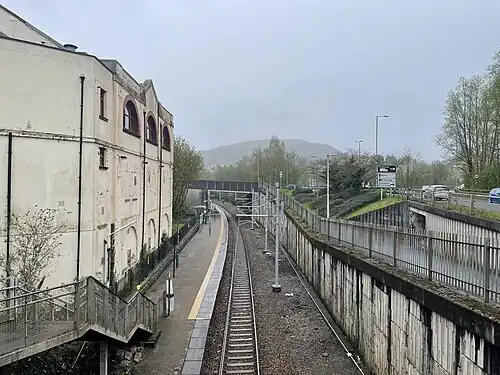 The original Pandy station was opened in 1841 by the Taff Vale Railway, and was situated opposite Walter Coffin's Dinas Middle Colliery. The station was closed in 1886 and later demolished, to be replaced by Dinas Station, built about 200 yards to the north. The Tonypandy and Trealaw station, built of red bricks and opened in 1908, was opposite the entrance to Foundry Road at the centre of two bridges, one of which crossed the river to Tonypandy and the other which crossed the railway lines to Judges’ Hall and to Trealaw.[1][2] This was demolished and replaced by the current station during major roadworks in the 1980s.