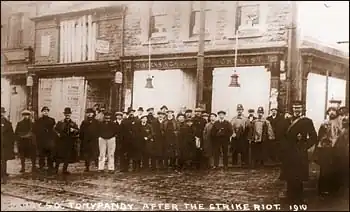What became known as the Tonypandy riots[1] of 1910 and 1911 (sometimes collectively known as the Rhondda riots) were a series of violent confrontations between striking coal miners and police that took place at various locations in and around the Rhondda mines of the Cambrian Combine, a consortium of mining companies in South Wales. The disturbances arose from an industrial dispute that began when the Naval Colliery Company locked out workers at the Ely Pit in Penygraig over payment rates for a new coal seam. By November 1910, approximately 12,000 miners employed by the Cambrian Combine were on strike.