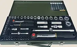 A toolbox could refer to several types of storage to hold tools. It could mean a small portable box that can carry a few tools to a project location or a large storage system set on casters.[2] Modern toolboxes are predominantly metal or plastic. Wood was the material of choice for toolboxes built beginning in the early 19th century.