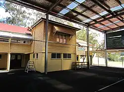 - an open-air annexe (1917, enclosed 1924), with its highset, timber-framed construction; west-facing verandah; single-skin verandah wall with ventilation flap; timber internal wall linings, and coved, pressed metal ceiling with iron tie rods