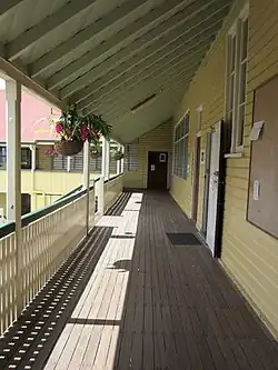 The north verandah has a timber balustrade; stop-chamfered verandah posts and beams; and a raked ceiling lined with diagonal wide timber beaded boards above exposed rafters. Original tall, vertically centre-pivoting windows survive at the western end of the verandah wall. Also at the western end is a former hat room enclosure with metal hooks attached to the walls. The enclosed south verandah retains stop-chamfered verandah posts and beams, and a raked ceiling lined with diagonal timber beaded boards above exposed rafters. The enclosed western verandah retains a raked ceiling lined with diagonal timber beaded boards above exposed rafters; rows of metal hooks mounted to the verandah wall; and remnant walls of a former hatroom at the northern end.[1]