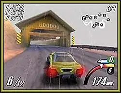 While racing, the player can pick up two power-ups: nitrous oxide and cash. The nitrous oxide can be used straight away, while the cash is added to the winnings at the end of the race and used for buying upgrades to the player's car.
