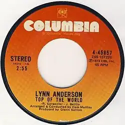 Country music singer Lynn Anderson covered the song in 1973 for her eighteenth studio album Top of the World, released on Columbia Records. It was the first single released from the album and her version became the first hit. Anderson's cover reached No. 2 on the US country singles chart and No. 74 on the Billboard Hot 100 in mid-1973. The success of Anderson's version prompted the Carpenters to release a new version as a single, where it topped the US pop singles chart for two weeks in December 1973.[21] Anderson's recording was produced by her then husband Glenn Sutton and Clive Davis. She later re-recorded the song for her 2004 album, The Bluegrass Sessions.