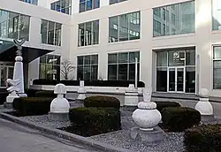 Topiary Lucere's composition is highly symmetrical, playing off the rectangles of glass on the stark facade it enhances. Six low concrete forms resembling chess pieces are set between square evergreen shrubs on either side of a plaza. The low forms are all the same height, but each features a different combination of rounded and angular elements. At the center, a tall concrete pedestal rises like an obelisk and is topped with an abstract textured glass ornament. At night, the glass is illuminated from within by a LED that changes colors as it glows. The obelisk is also lit from below at night, creating a focal point for the garden.[2]