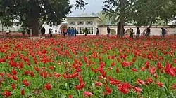 Surrounded by high walls, the First Courtyard (I. Avlu or Alay Meydanı) functioned as an outer precinct or park and is the largest of all the courtyards of the palace. The steep slopes leading towards the sea had already been terraced under Byzantine rule.[30] Some of the historical structures of the First Courtyard no longer exist. The structures that remain are the former Imperial Mint (Darphane-i Âmire, constructed in 1727), the church of Hagia Irene and various fountains. The Byzantine church of Hagia Irene was used by the Ottomans as a storehouse and imperial armoury.[31] This courtyard was also known as the Court of the Janissaries or the Parade Court. Court officials and janissaries would line the path dressed in their best garb. Visitors entering the palace would follow the path towards the Gate of Salutation and the Second Courtyard of the palace.[32]