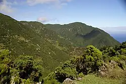 Owing to age, continuous effusive eruptions occurred simultaneously with the eruption on the island of Faial, along the Volcanic Complex of Ribeirinha.[1] Volcanism in this zone continued, with some interruptions over the next 500,000 years approximately.[1] But, continuous erosion, from coastal action, humidity and rainfall, wind and thermal amplitudes, resulted in an interior relief forming a more gently appearing landscape, in comparison to the western areas of Ribeira Seca.[1]