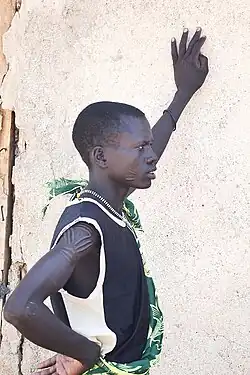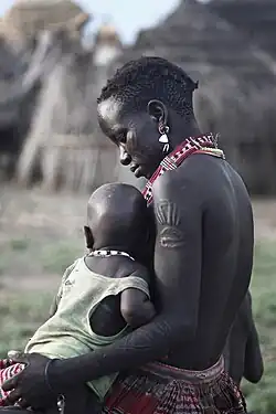The Toposa believe in a supreme being and in ancestral spirits, who may assist in overcoming problems such as drought or epidemics of disease among their herds.[3] They believe that men originally lived with "Nakwuge" in the sky, but many slid down a rope to earth. The rope then broke, separating them from heaven.[12] As of 2000, perhaps 5% of the population could read.[1] The Toposa culture is orally transmitted through songs, dance, music, poems and folklore. The Roman Catholic Diocese of Torit has been actively proselytizing among the Toposa, with some success.[3]