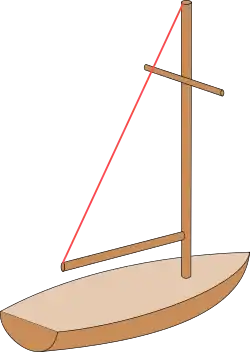 Part of the running rigging, topping lifts are primarily used to hold a boom up when the sail is lowered.[1] This line would run from near the free end of the boom(s) forward to the top of the mast. The line may be run over a block at the top of the mast and down to the deck to allow it to be adjusted. For small booms, the topping lift may be run from end of the boom to the backstay or next mast aft. When the sail is raised again, the topping lift is loosened or removed. On sailboats used for racing, boom lift function is frequently incorporated into the boom vang system, to reduce the number of lines aloft. Allowing the vang to take this function also simplifies operation of the boat.[2]