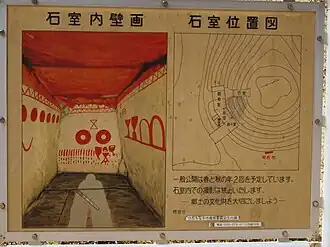 Internally, the tumulus has a stone burial chamber made from large blocks of tuff that opens to the south side of the posterior circular portion, and which was found to be intact from ancient times. The chamber has a length of 2.8 meters, width of 1.8 meters, height of 1.4 meters. Within was the skeletal remains of one adult male. Grave goods included a lacquered small iron sword, iron spears, fragments of armor and horse harnesses, iron stirrups, and other items. Of great interest was that the walls, floor and ceiling of the burial chamber had been painted and decorated. The floor and ceiling were vermillion, whereas the walls were coating in a white clay and covered with geometric patterns in vermillion. These drawings included concentric circles, hourglass-shaped designed and a serrated border at the ceiling.[2]