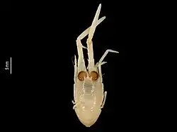 Males measure 5.8–9.5 mm (0.23–0.37 in) and females 4.1–8.1 mm (0.16–0.32 in) in postorbital carapace length.[a] The body and the appendages are whitish. The carapace has some yellowish bands on the gastric area and on the posterior and lateral margins.[2]