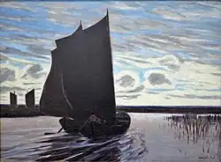 For about 150 years pitch-black turf barges with puce sails were a usual sight in summers and autumns on the watercourses in the Teufelsmoor region.[1] For the shallow mire and drainage watercourses one needs special boats, Torfschiffe.[31] A Torfschiff (literally: turf ship) is a flat-bottomed barge, with similarities to a punt as to construction and propulsion, or a weidling as to material. Torfschiffe can be propelled by poling with quants of 3.6 metres (12 ft) in navigable drainage ditches of 4.5 metres (15 ft) of width or in rivers like Wümme and Lesum,[58] resulting from the former's confluence with the Hamme. However, with wind they can also sail on rivers wide enough. Many watercourses also had lateral towpaths allowing haulage.[2]