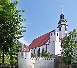 The early Renaissance Hartenfels Castle dominates the town. The chapel was built in 1544 (designed by Nickel Gromann) and combines late Gothic with early Renaissance elements. It was consecrated by Martin Luther on 5 October 1544. Brown bears are still kept in the moat.
