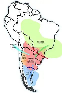 South America's tornado corridor region is favorable for tornadoes and severe thunderstorms due to the large size of the Pampas Plain where the cold, dry air from Patagonia, the Andes, and Antarctica collides with warm, moist air from areas of Brazil, northern Argentina, and Paraguay.[2]